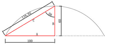 ③弦高弦長(zhǎng)構(gòu)成三角形 邊長(zhǎng)即為 a=100 b=60 根據(jù)勾股定理計(jì)算c邊長(zhǎng) 勾股定理公式:a平方+b平方=c平方 即:c=116.62