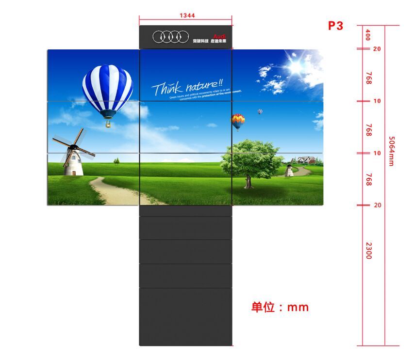 LED旋轉(zhuǎn)屏以靈活多變的旋轉(zhuǎn)姿態(tài)吸引著人們的注意,其結(jié)構(gòu)整體為三角柱體形狀,中間視頻顯示部分由三層三角形LED箱體構(gòu)成。在旋轉(zhuǎn)系統(tǒng)的控制下,三個LED屏體相互配合,旋轉(zhuǎn)動作與視頻畫面協(xié)調(diào)運作,三面共九個小LED顯示屏可單獨播放視頻,也可拼接為三個視頻或?qū)⑷嫒龑覮ED拼接為一個整體視頻播放。動態(tài)屏幕與視頻畫面完美結(jié)合,為人們帶來震撼的視覺沖擊力,進而促進投放戶外廣告的有效傳播。