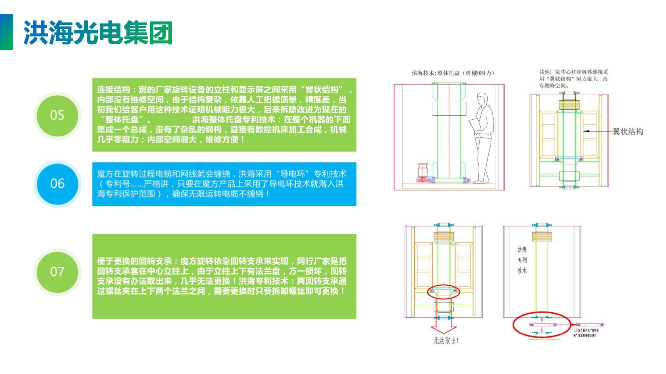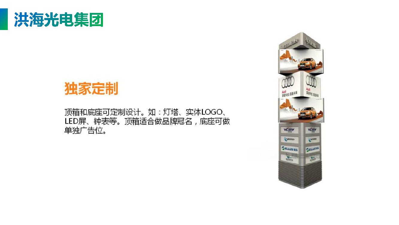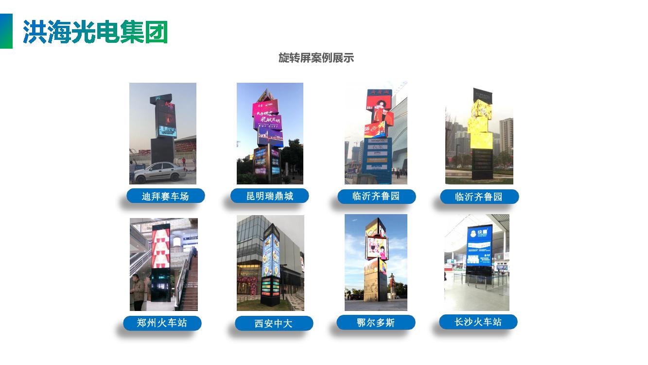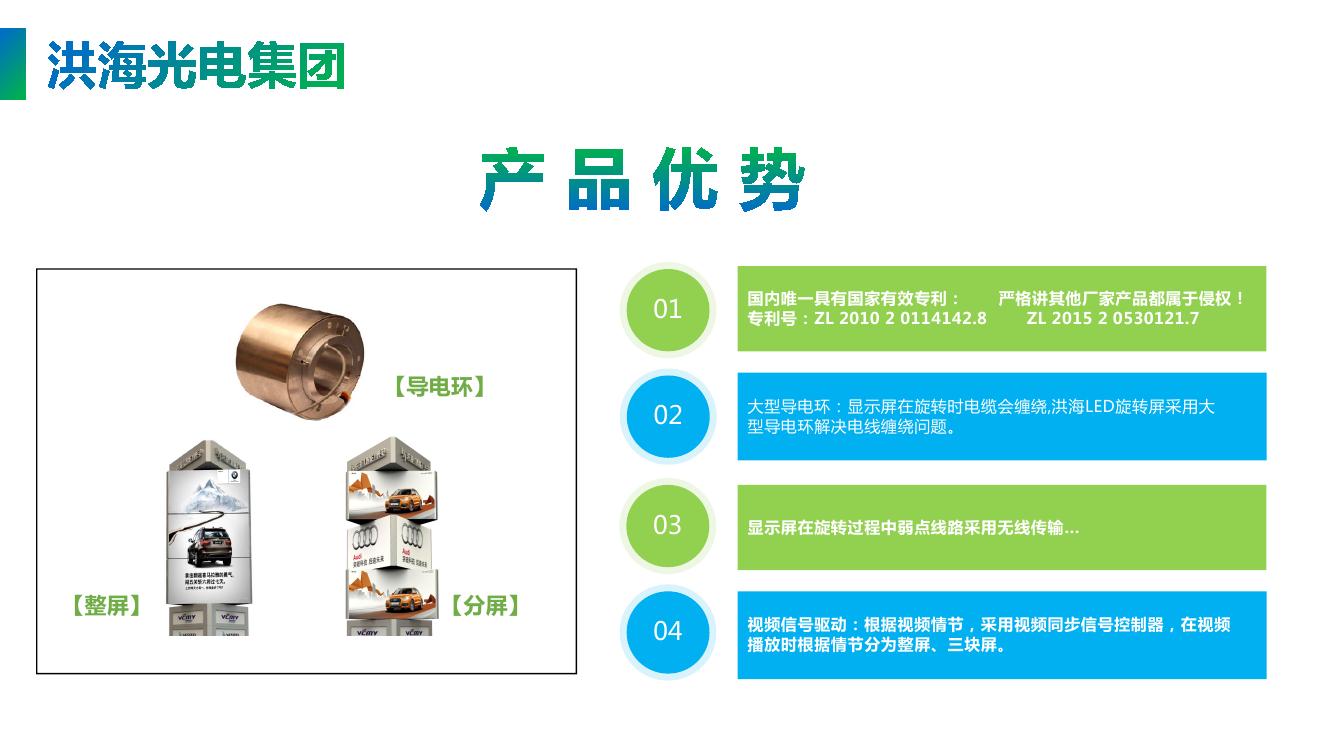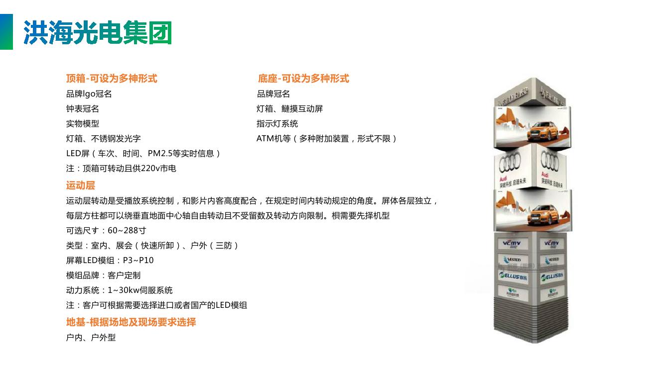 具體來說是:LED旋轉(zhuǎn)魔方屏是由三角形或四方形LED顯示屏箱體組合,在旋轉(zhuǎn)支撐、不繞線導電刷、轉(zhuǎn)動花樣軟件編程等多個系統(tǒng)配合下,使三個三角形或四方形LED顯示屏按照電腦編制的程序---不同時間花樣轉(zhuǎn)動---定格在一個平面,展示三個視頻畫面。相比傳統(tǒng)顯示屏更具有動感和視覺沖擊力,新穎的廣告形式,大大提高了顯示屏的功能檔次和外觀裝飾效果,同時具有藝術氣質(zhì)的高科技產(chǎn)品,瞬間吸引您的眼球,提升廣告創(chuàng)意,帶來更大的商業(yè)價值,成為美化城市的城市地標。